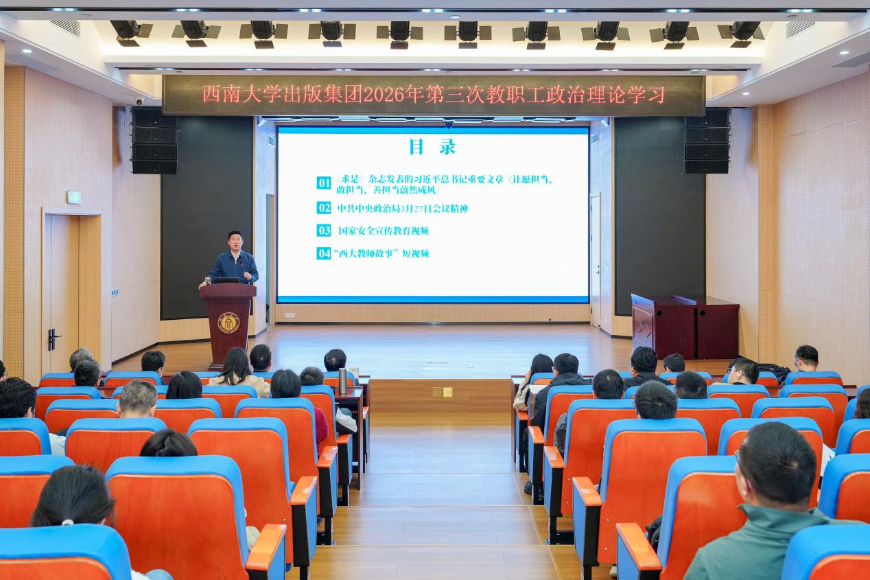4月3日下午,集团在出版大楼305报告厅开展2026年第三次教职工政治理论学习,集中学习习近平总书记重要文章《让愿担当、敢担当、善担当蔚然成风》及中共中央政治局3月27日会议精神,并观看了国家安全宣传教育视频及“西大教师故事”短视频。全体职工以线上...