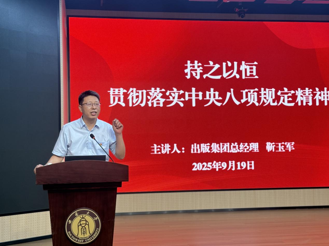 出版集团总经理讲授作风建设专题党课9月19日,出版集团总经理靳玉军为集团中层干部及全体党员集体讲授作风建设专题党课。 靳总经理聚焦“持之以恒贯彻落实中央八项规定精神”这一主题,从中央八项规定与中央八项规定精神内涵、贯彻中央八项规定精神的重...