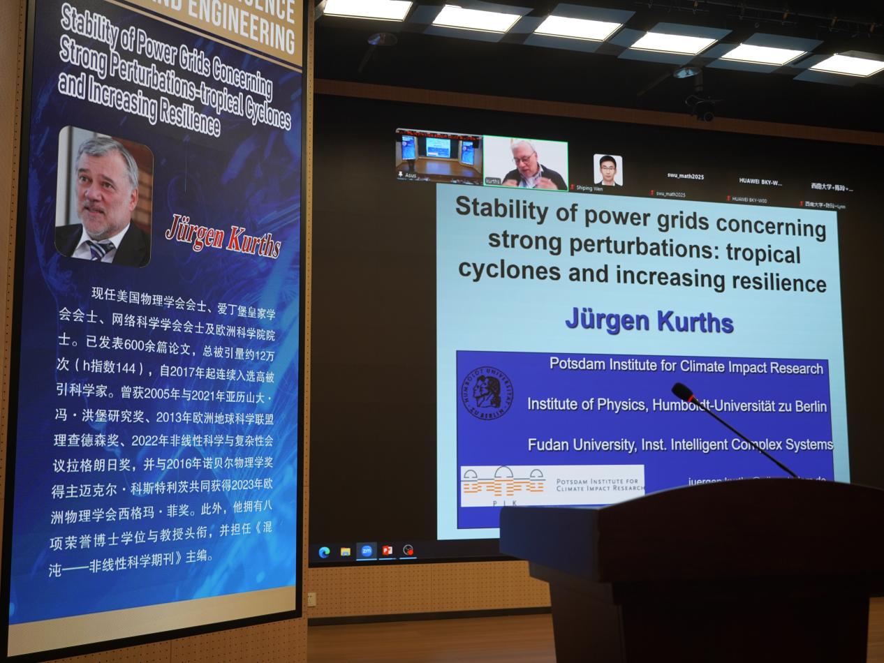 美国物理学会会士、爱丁堡皇家学会会士、网络科学学会会士及欧洲科学院院士,德国洪堡大学Jürgen Kurths 教授以《Stability of Power Grids Concerning Strong Perturbations-tropical Cyclones and increasing Resilience》为题,讨论了涵盖强扰动的吸引域稳定性概念及其在高维系统中的评估方法,并识别出电网中最脆弱的拓扑结构模式;继而分析了损耗性条件下引发的非期望动力学行为。