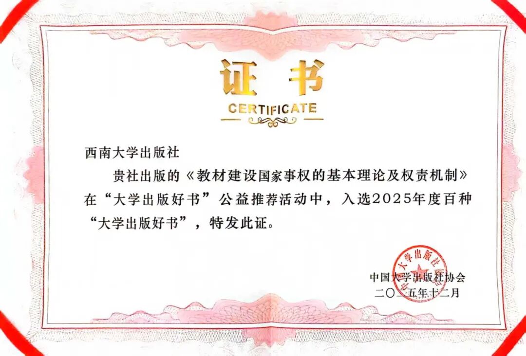 12月13日,中国大学出版社协会2025年年会上发布了2025年度“百种大学出版好书书目”。我社出版的《教材建设国家事权的基本理论及权责机制》荣幸入选。本次好书推荐,全国共有100家大学出版社,报送了400余种图书,经过专家审核,推选出84家大学出版社的100种好书,其中主题出版类 22 种,高校教材类 30 种,学术著作类 30 种,大众图书类 18 种。