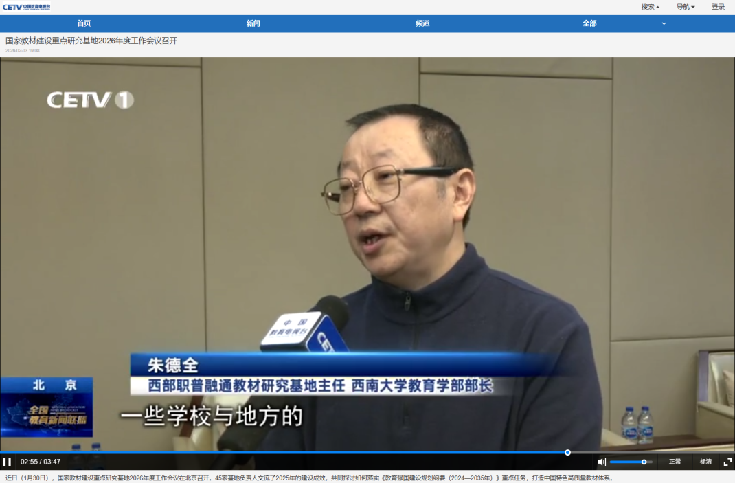 会上,教育部教材局公布了国家教材基地管理指标体系实施情况,由集团支持并参与共建的西南大学“西部职普融通教材研究基地”在2025年度国家教材建设重点研究基地年度评估中排名全国第二,基地建设成效显著。会议期间,基地主任、西南大学教育学部部长朱德全教授在会上作了基地年度工作汇报,并接受中国教育电视台专访,解读基地建设路径与成果,相关内容已在中国教育电视台播出。