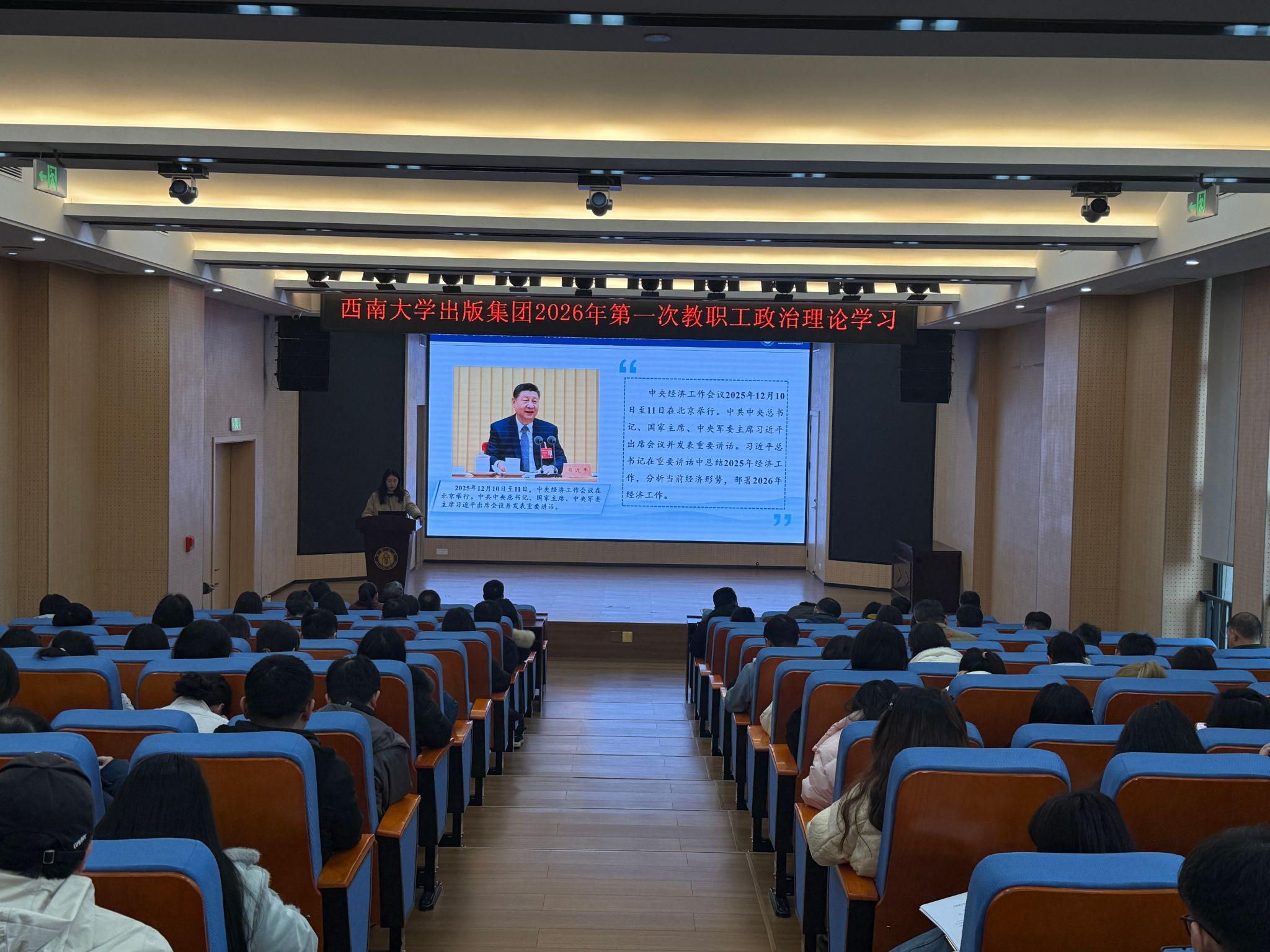 1月16日下午,集团在出版大楼305报告厅开展了2026年一次教职工政治理论学习,集中学习了国家主席习近平发表的二〇二六年新年贺词、习近平总书记在全国政协新年茶话会上的重要讲话精神、习近平总书记对做好“三农”工作作出的重要指示精神、习近平总书记在中央经济工作会议上的重要讲话精神、会前观看了“AI+WPS智能办公新体验”推广系列视频 (第三期):轻松玩转表格和数据。集团全体职工线上线下参会,集团党委副书记、纪委书记、副总经理(兼)陈玥主持并领学。
