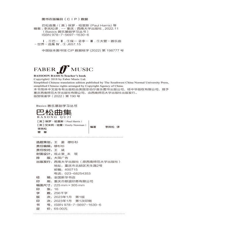 本书是是丛书中《巴松》一书的配套图书,作为曲集也可单独使用。书中的乐曲都配有钢琴伴奏,其中新增加的中国乐曲的钢琴伴奏由中央音乐学院的专业教师重新编写。另外,每一首乐曲都配有伴奏音频和示范音频,学生可以扫码播放伴奏音频进行巴松的重奏练习,也可以利用伴奏音频直接进行舞台表演。本书可以作为所有把巴松入门学生的配套曲集。