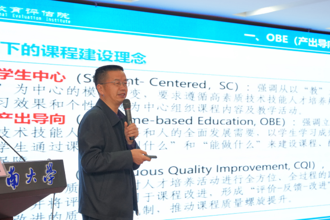 黄承国所长在题为“基于 OBE 理念的课程建设路径与策略”的报告中介绍了OBE(产出导向)的理念内涵,基于OBE的课程建设逻辑主线和课程质量保证,以及落实OBE理念的学校工作策略。