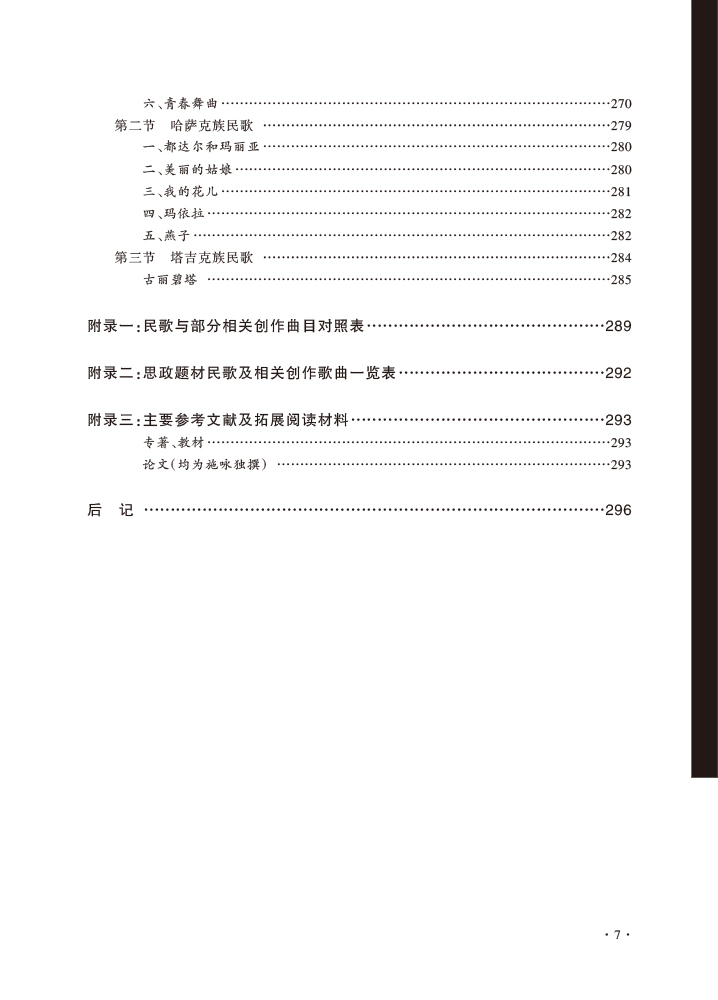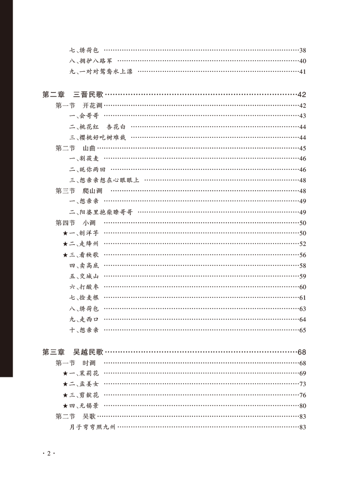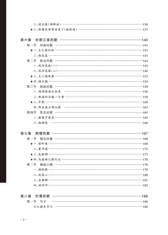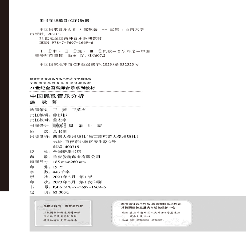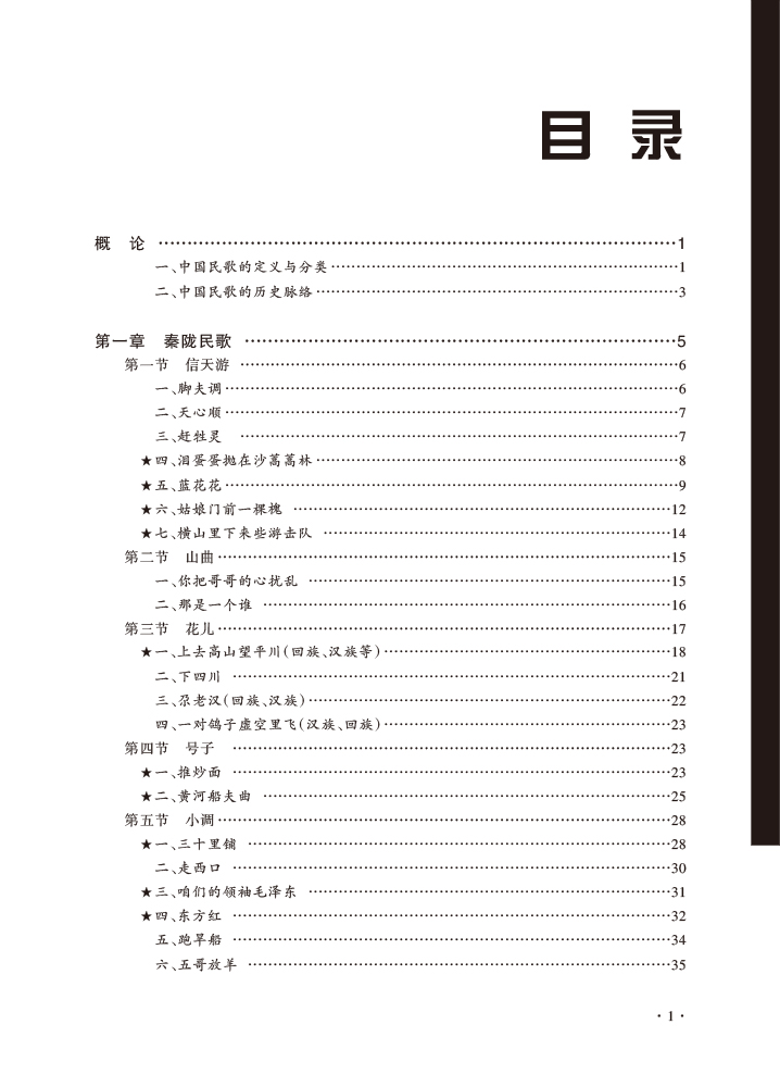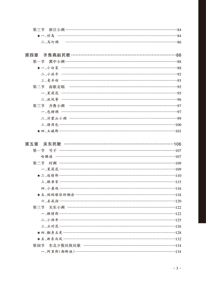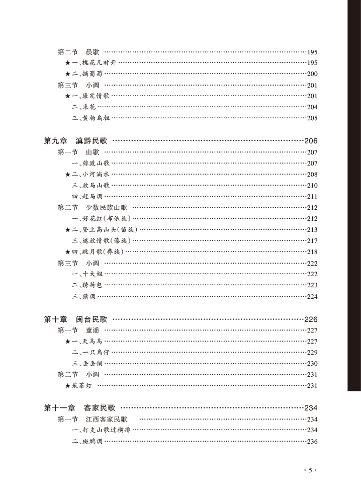 中国民歌是当下音乐专业教学中必不可少的内容,但从当下的民歌教材总体来看,有重学唱实践、轻理论分析的倾向,且在民歌音乐分析上未成体系,教学内容尚显陈旧,未将民歌最新相关研究成果纳入其中,对民歌运用于当代创作与传播的教学内容亦较少涉及。后三章按行政区划,包括内蒙古、西藏、新疆民歌,全书收入近150首民歌。其中标五角星的民歌是教学重点曲目,在基础分析上,还加上全面深入分析的“研究学习”,以及相关知识点介绍的“拓展链接”,还有运用于现代音乐创作及当代传播的“创作传播”板块。