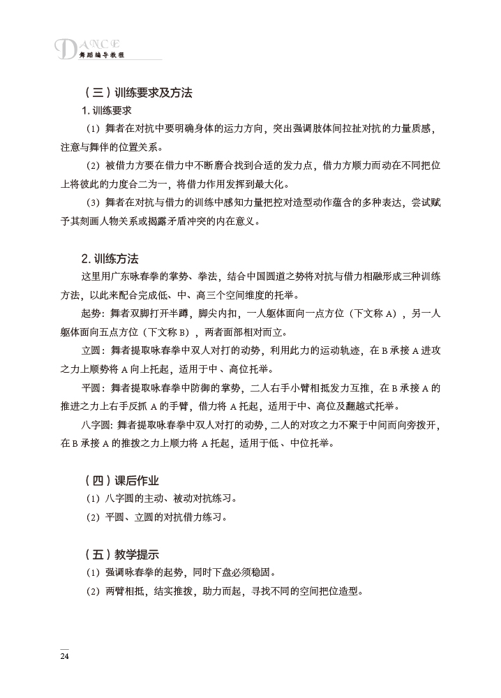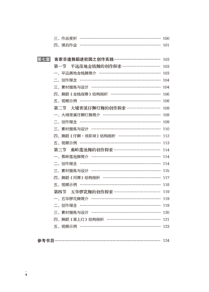 本书是针对普通高校舞蹈专业编写的实用型教材,对不同类型舞蹈的创作方法与表现形式进行了详细介绍,教材共七章,包括普通高等院校舞蹈学编导教学概述,独舞编创启蒙,双人舞、三人舞编导技法,群舞综合编导技法,舞蹈小品的构思与创作,学前及中、小学舞蹈编创及客家非遗舞蹈进校园之创作实践, 课程内容丰富,以多维、立体、较全面的教学理念开发学生的舞蹈编创思维,操作性较强。