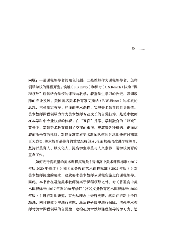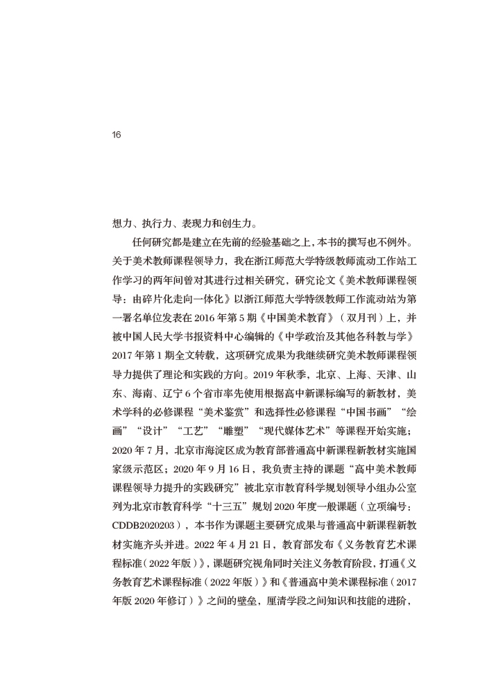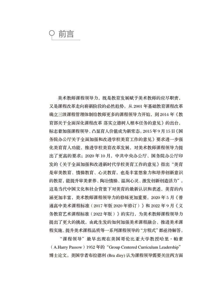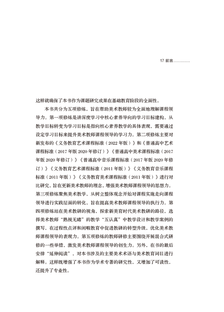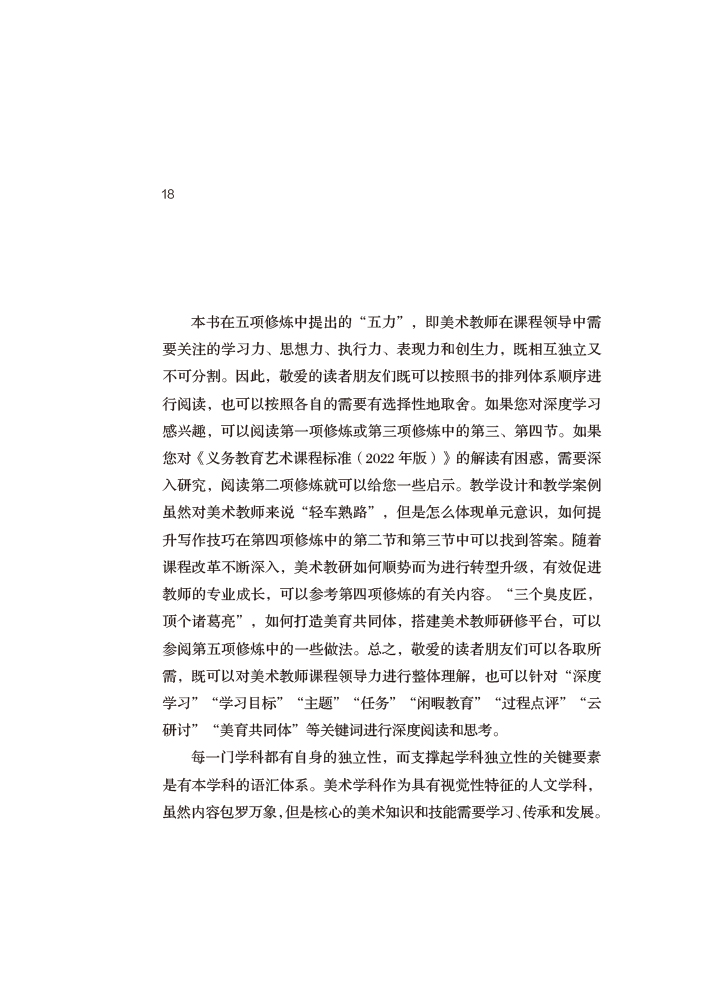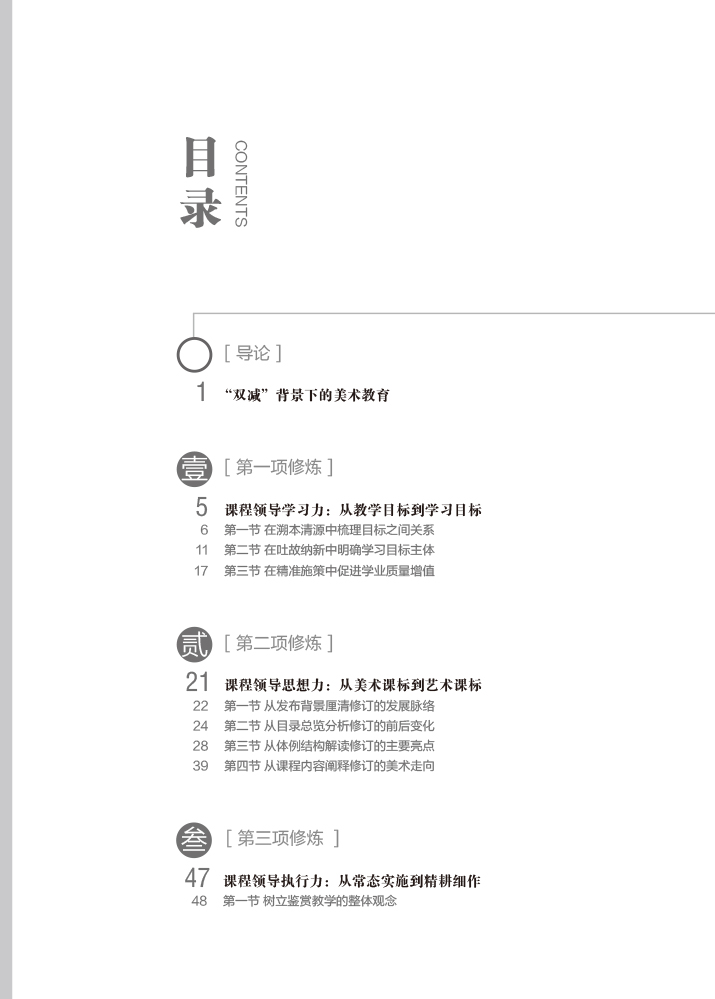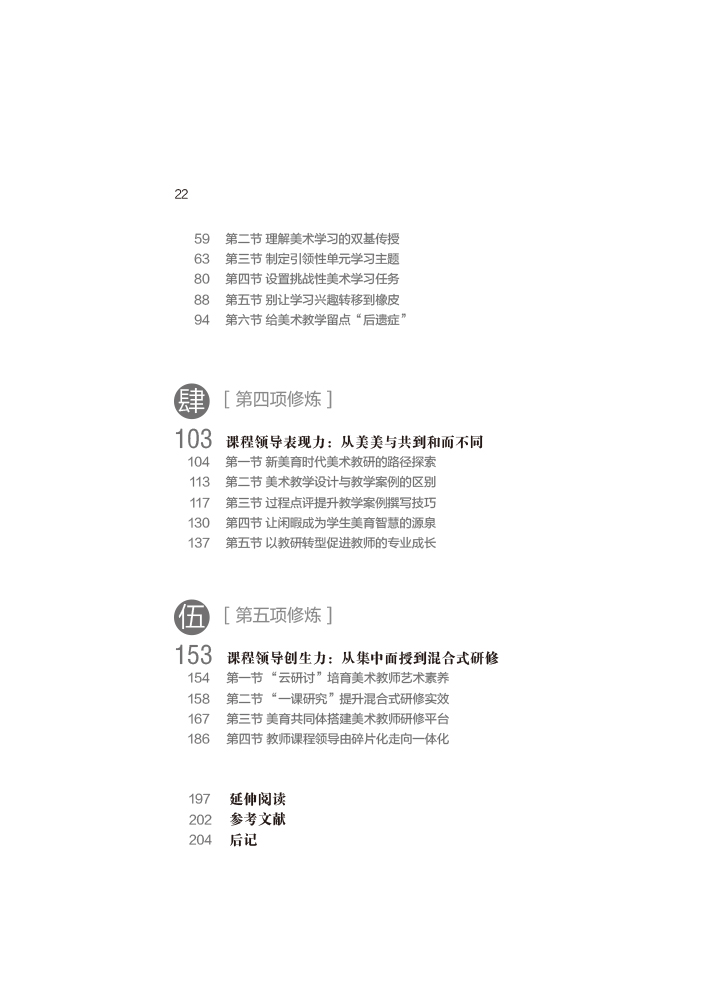 本书聚焦当下美术教师关注的焦点问题,旨在帮助美术教师较为全面地理解课程领导力。本书包含美术教师课程领导力的五项修炼:第一项修炼 课程领导学习力:从教学目标到学习目标;第二项修炼 课程领导思想力:从美术课标到艺术课标;第三项修炼 课程领导执行力:从常态实施到精耕细作;第四项修炼 课程领导表现力:从美美与共到和而不同;第五项修炼 课程领导创生力:从集中面授到混合式研修。书的最后补充了“延伸阅读”,对本书涉及的主要美术术语与美术教育词目进行解释,增强了学术专著的研究性,同时也增加了可读性,提升了专业性。