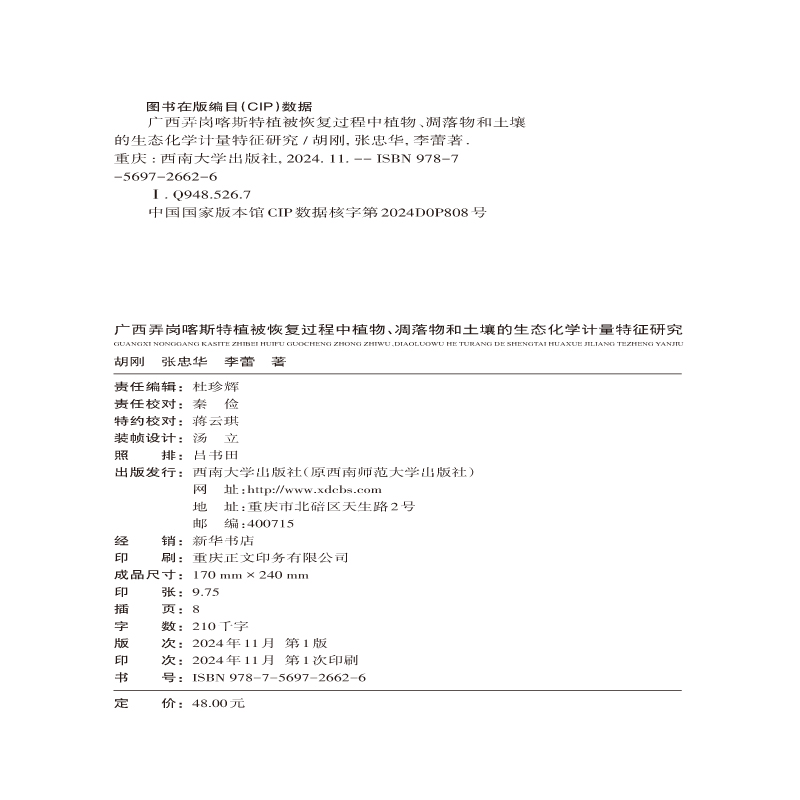 广西弄岗喀斯特植被恢复过程中植物、凋落物和土壤的生态化学计量特征研究-胡刚-9787569726626
